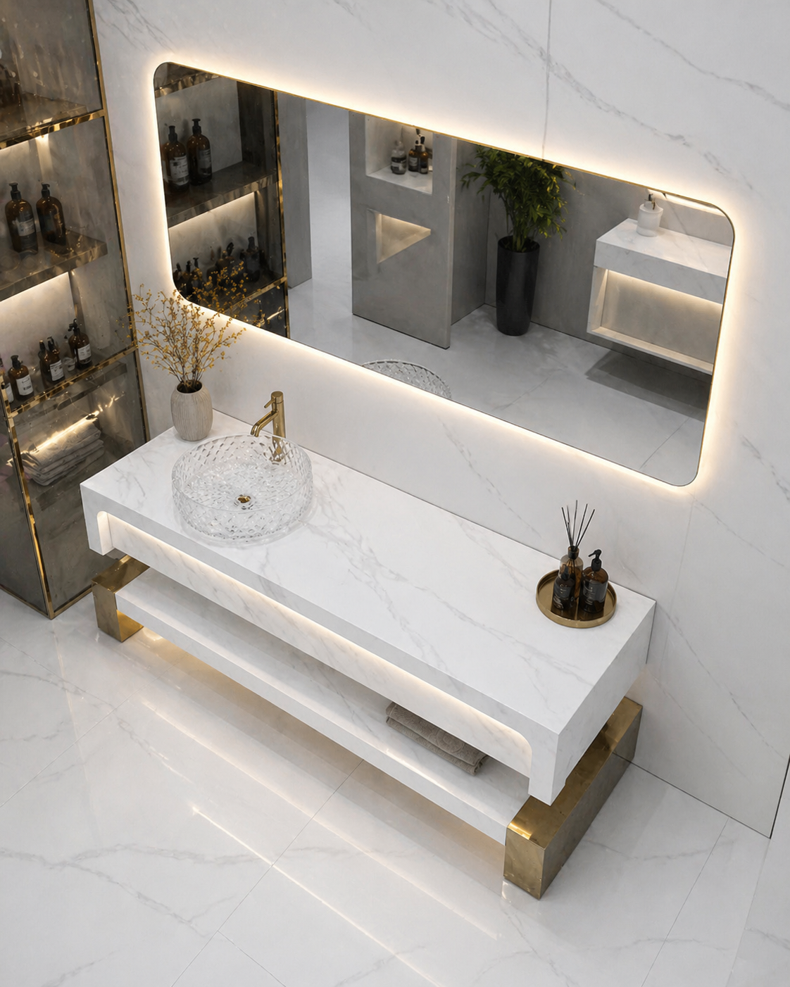التصميم المعلق (Floating Vanity) يضيف إحساس بالمساحة والاتساع داخل الحمام، ويجعل التنظيف أسفل المغسلة أسهل بكثير، بالإضافة إلى وجود رف سفلي عملي يمكن استخدامه لتخزين المناشف أو الإكسسوارات بطريقة مرتبة وأنيقة.