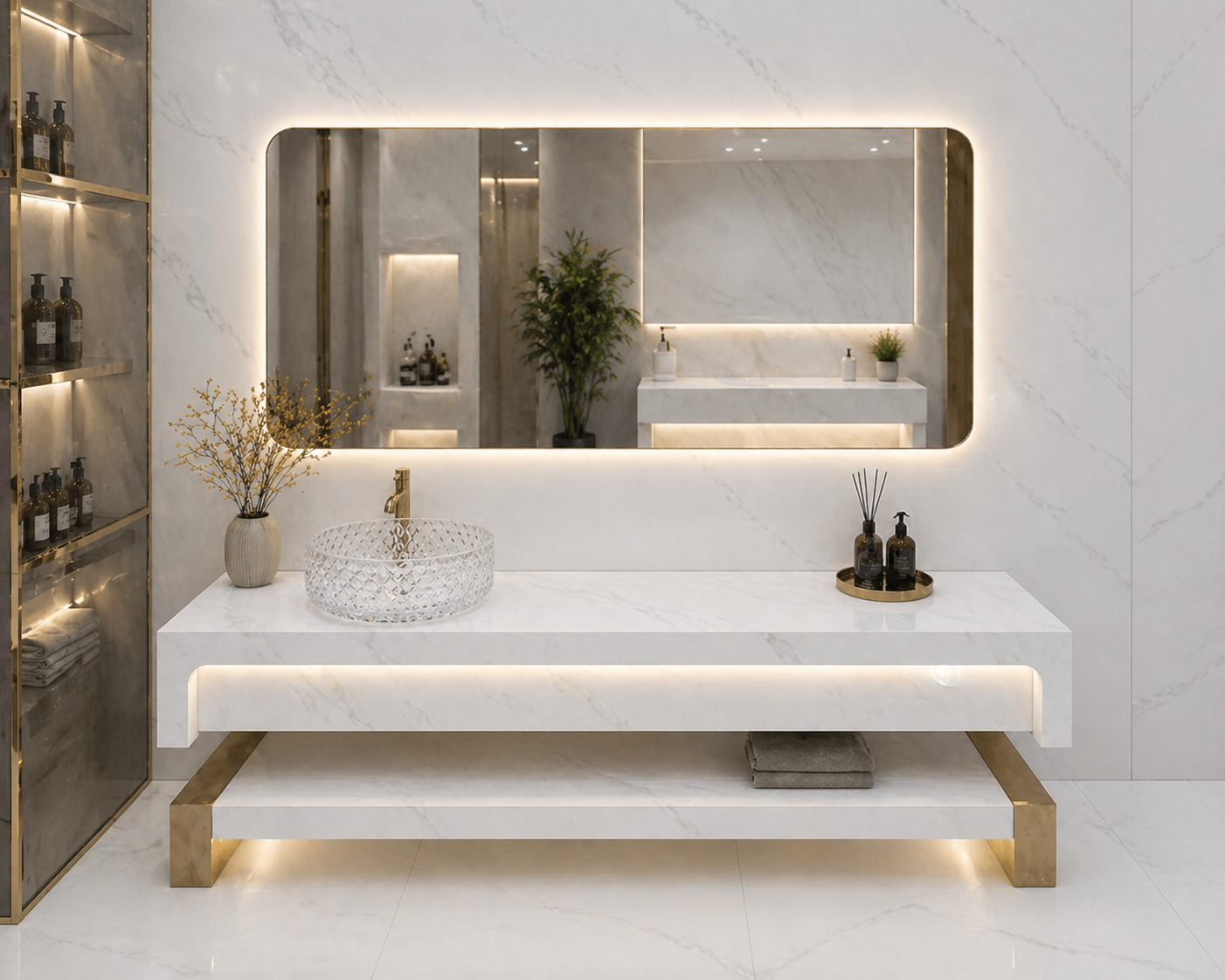المغسلة مزودة بإضاءة LED مخفية أسفل السطح، تعطي إضاءة هادئة وفخمة تضيف جو راقي داخل الحمام، خاصة في الاستخدام الليلي، وتبرز تفاصيل التصميم بشكل احترافي. الإضاءة ليست فقط جمالية بل تعزز من تجربة الاستخدام وتضيف لمسة حديثة تناسب أحدث تصاميم الحمامات المودرن.