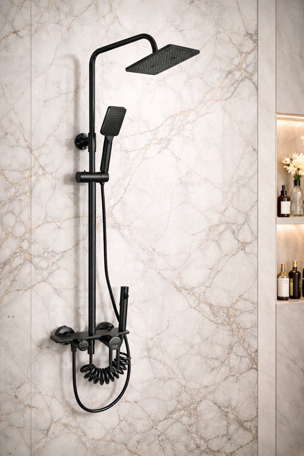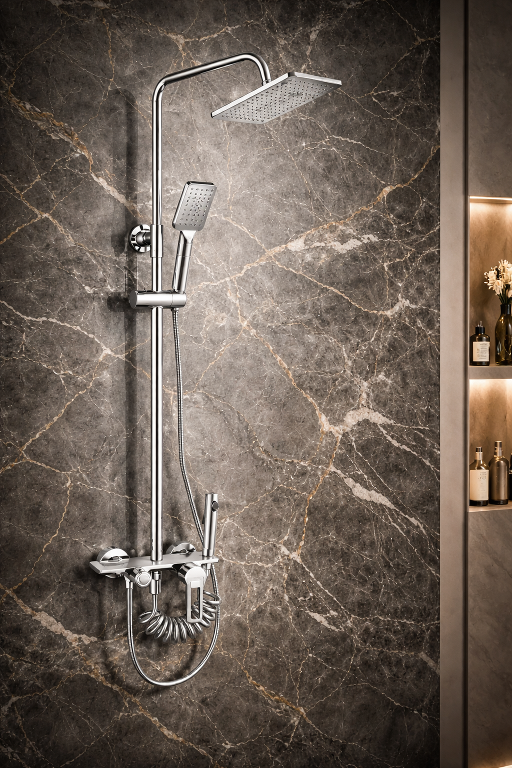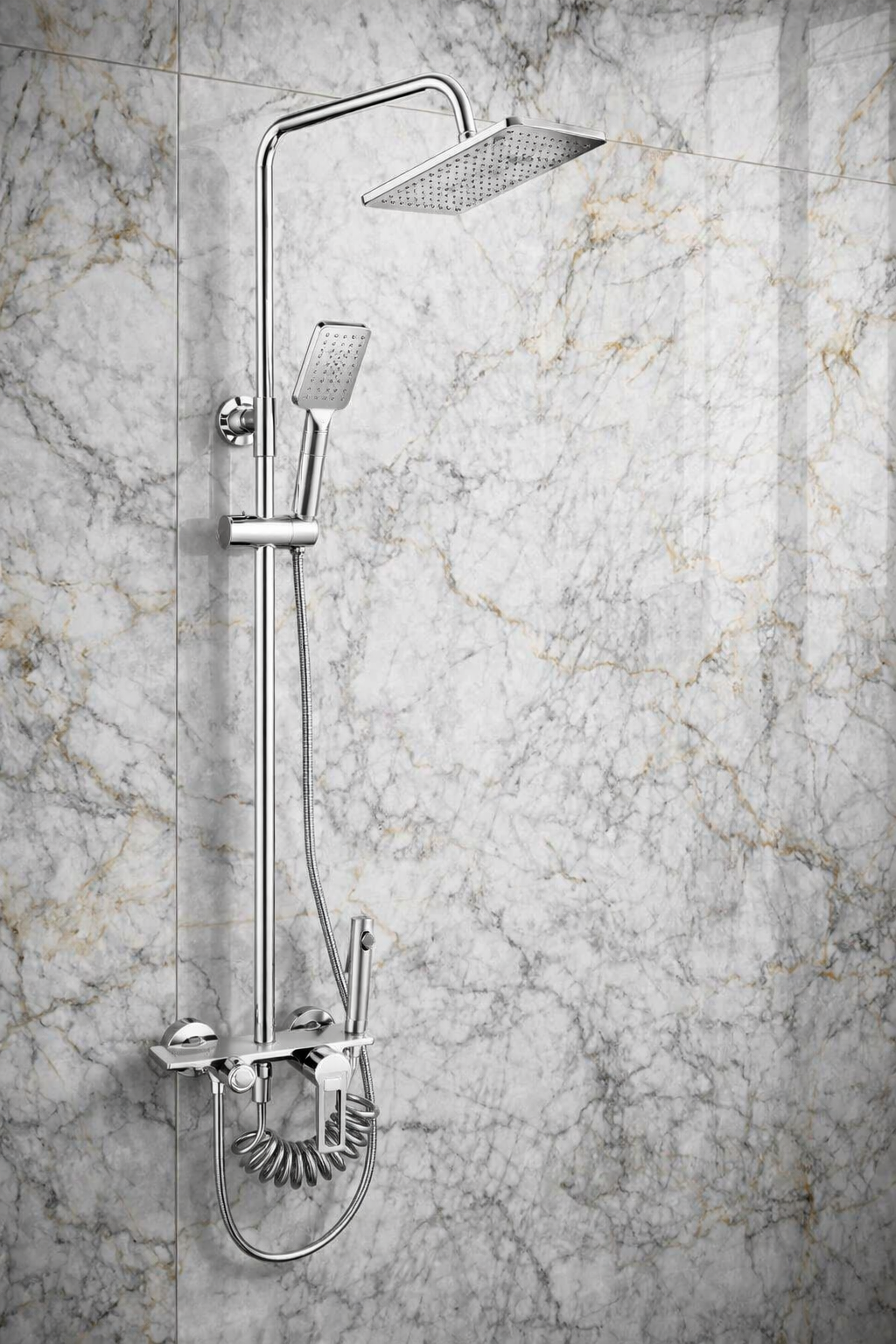 يأتي خلاط الدش برأس دش علوي مطري مربع يوفر تدفق مياه متوازن يغطي مساحة واسعة من الجسم، مما يمنحك إحساساً بالراحة والاسترخاء أثناء الاستحمام. كما يحتوي على دش يدوي عملي يمكن استخدامه بسهولة لتوجيه المياه حسب الحاجة، سواء أثناء الاستحمام أو لتنظيف أجزاء مختلفة من الحمام.
