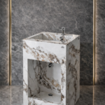 كما أن الحوض العلوي مصمم بعمق مناسب لمنع تناثر المياه والحفاظ على نظافة المكان، بالإضافة إلى وجود فتحة تصريف مريحة تساعد على خروج المياه بسهولة. الهيكل المتكامل للمغسلة يعطي قوة ومتانة عالية مع مظهر حديث يناسب الحمامات الفخمة أو أماكن الوضوء في المساجد.