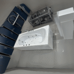 شكل الجاكوزي يعطي لمسة جمالية للحمام، وحجمه مناسب جدًا للزاوية دون أي ازدحام.