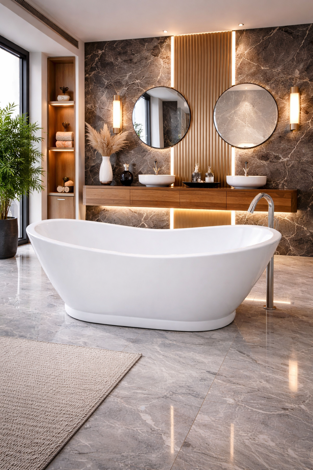 التصميم المودرن يجعل هذا البانيو مناسبًا لمختلف أنماط الديكور، سواء كانت حمامات حديثة، كلاسيك مطور، أو حتى تصميمات فندقية فاخرة. لونه الأبيض النقي يعكس الإضاءة بشكل جميل ويعطي إحساسًا بالنظافة والاتساع، كما يمكن تنسيقه بسهولة مع خلاطات أرضية كروم أو أسود مطفي لإكمال المظهر العصري.