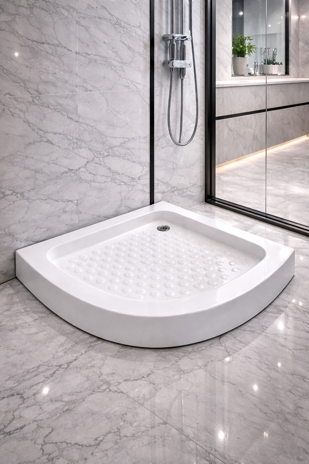 تصميم الحوض الزاوية يعطي استغلال ذكي للمساحات، مع شكل انسيابي يتناسب مع كبائن الشاور الزجاجية ويضيف لمسة جمالية مميزة داخل الحمام. كما يحتوي على سطح داخلي مزود بنقاط مانعة للانزلاق لزيادة الأمان أثناء الاستخدام، خاصة في البيئات الرطبة.