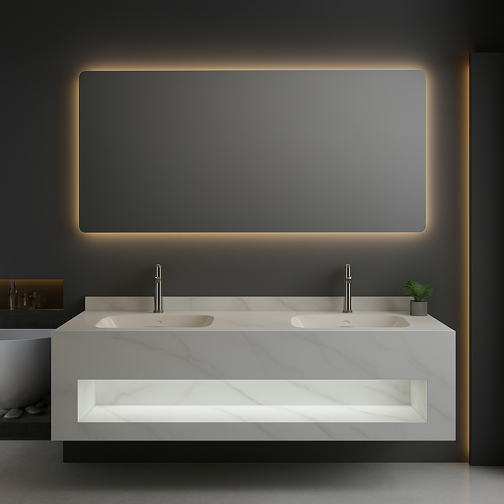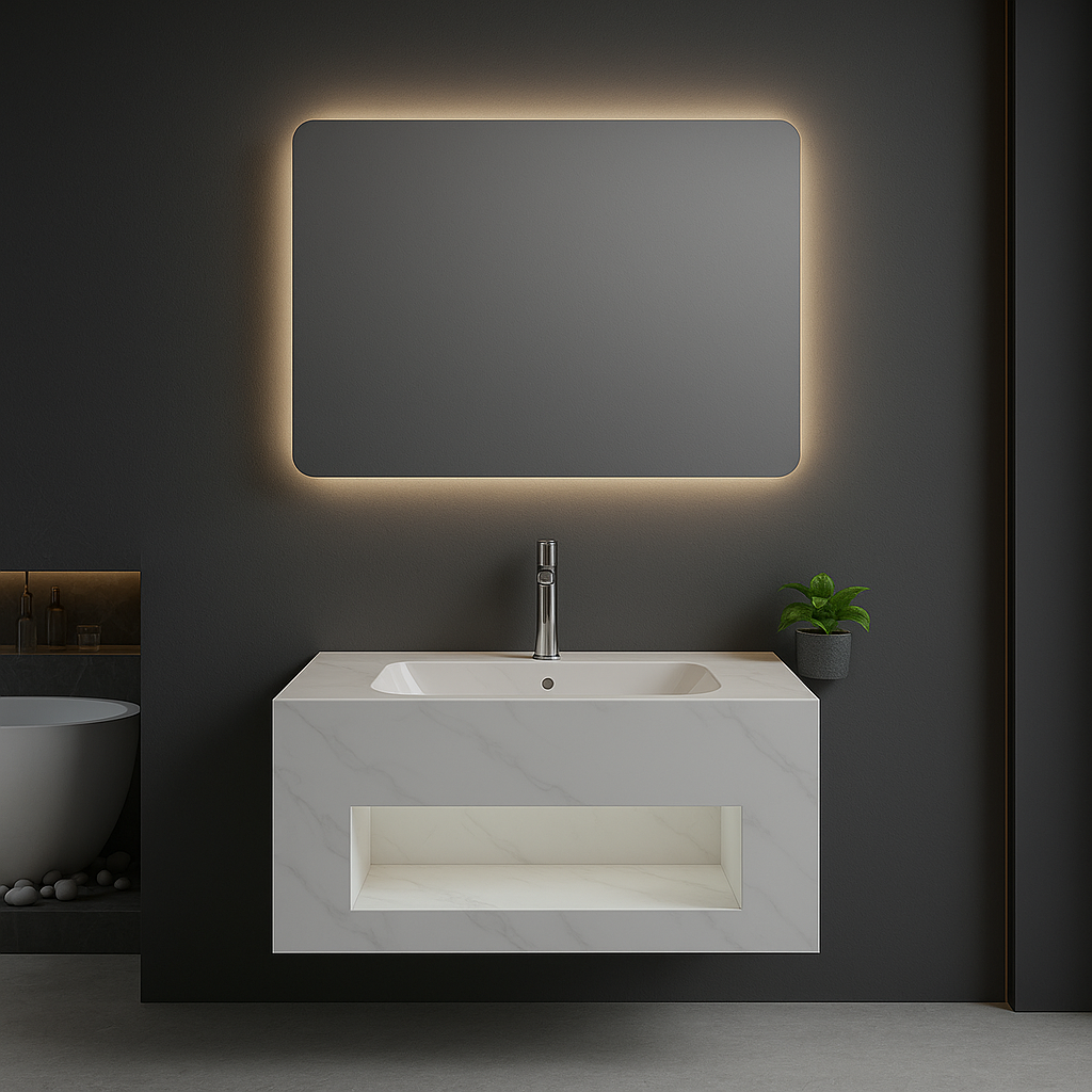 مع إضاءة مخفية بثلاثة مقاسات مميزة: 80 سم و100 سم و150 سم، مما يجعلها مناسبة للمساحات الصغيرة والكبيرة على حد سواء. تتميز بتصميمها العصري الذي يبرز جمال الرخام الطبيعي، بينما تضيف الإضاءة المخفية هالة من الدفء والرقي.