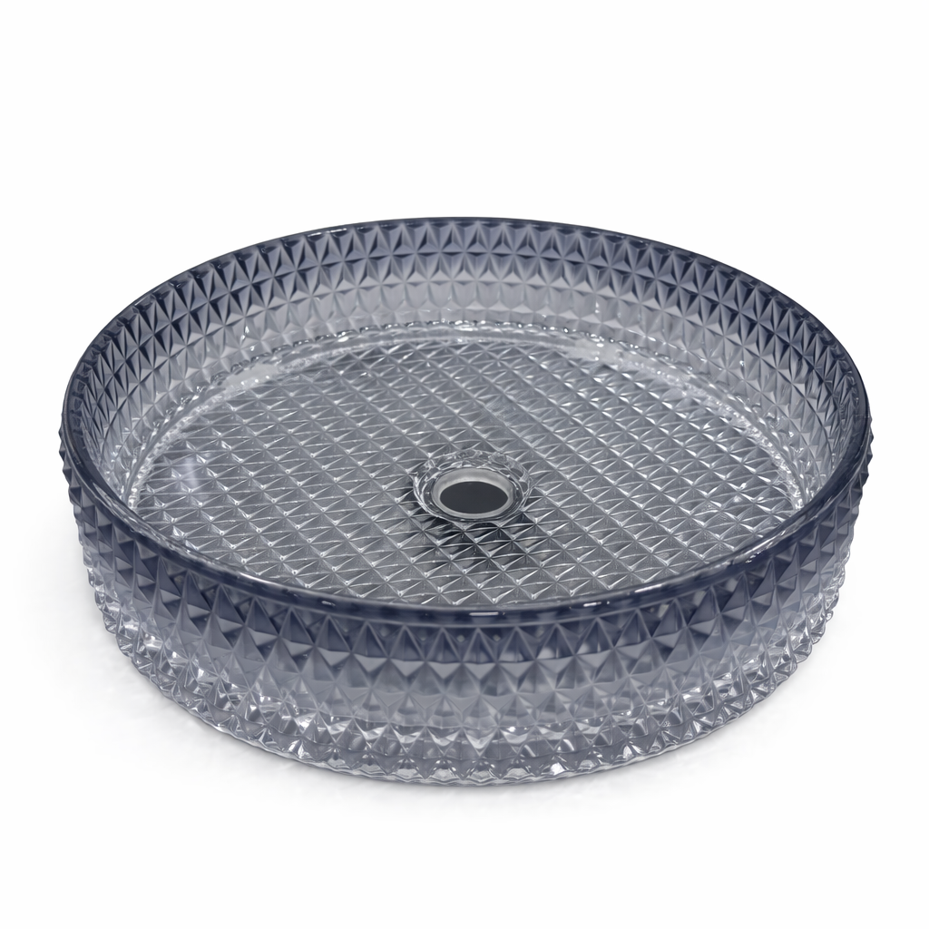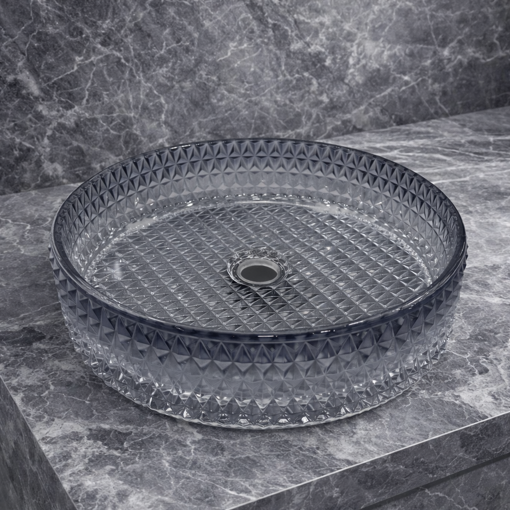 تتميز مغسلة الزجاج هذه بنقشة هندسية ثلاثية الأبعاد مستوحاة من تصميم الألماس، حيث تغطي التفاصيل الدقيقة كامل السطح الداخلي والخارجي، ما يعكس الإضاءة بشكل جميل ويمنح تأثيراً بصرياً فاخراً. هذا التصميم لا يضيف فقط جمالاً استثنائياً، بل يعزز أيضاً من قوة الزجاج ومتانته، مما يجعلها عملية للاستخدام اليومي.