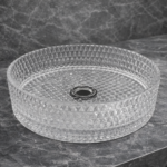 تتميز هذه المغسلة بنقشة هندسية دقيقة مستوحاة من شكل الألماس، حيث تغطي التفاصيل ثلاثية الأبعاد كامل السطح الداخلي والخارجي، ما يمنحها مظهراً فريداً يلفت الانتباه من أول نظرة. هذا التصميم لا يضيف جمالاً بصرياً فقط، بل يعزز أيضاً من متانة الزجاج وقوة تحمله للاستخدام اليومي.
