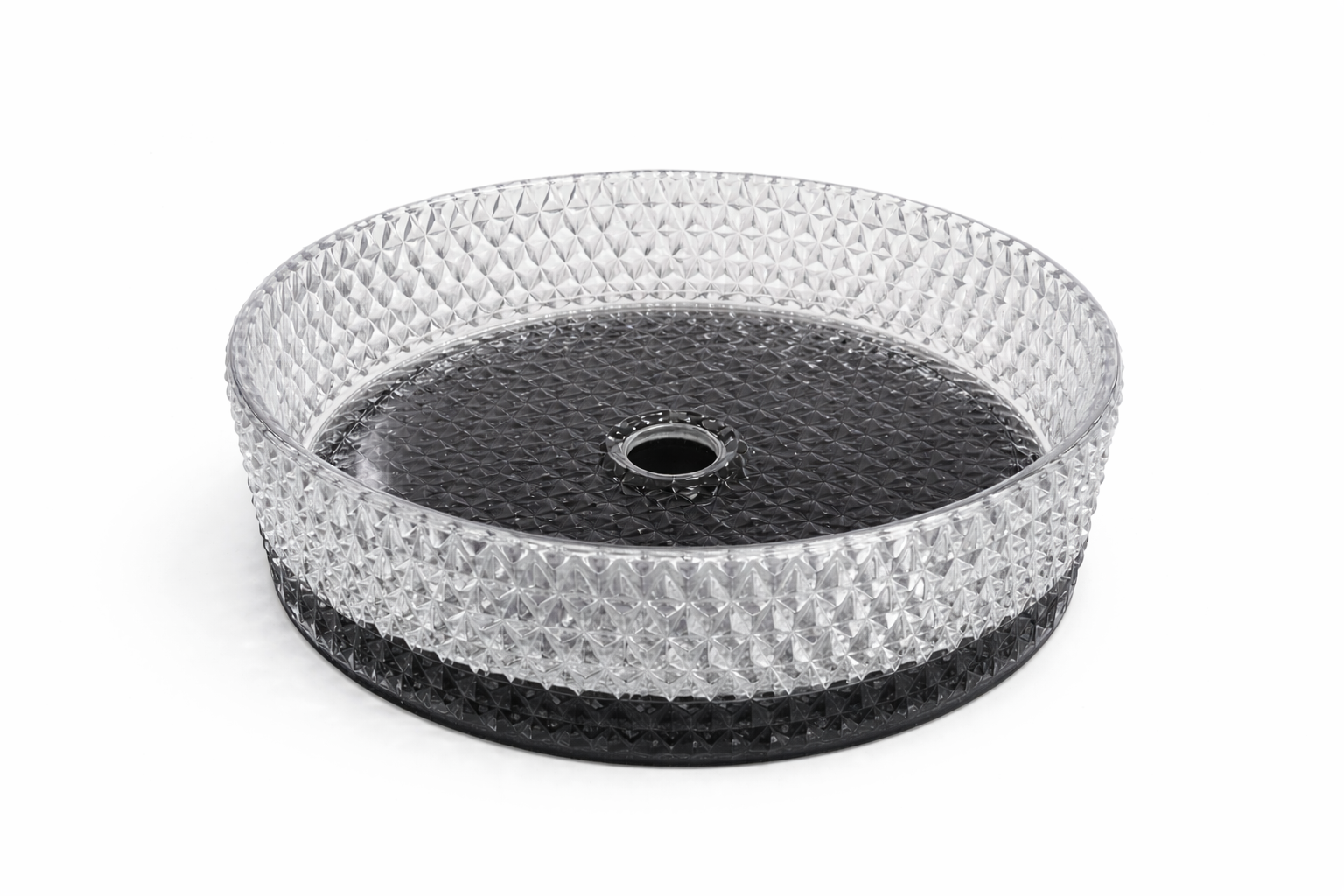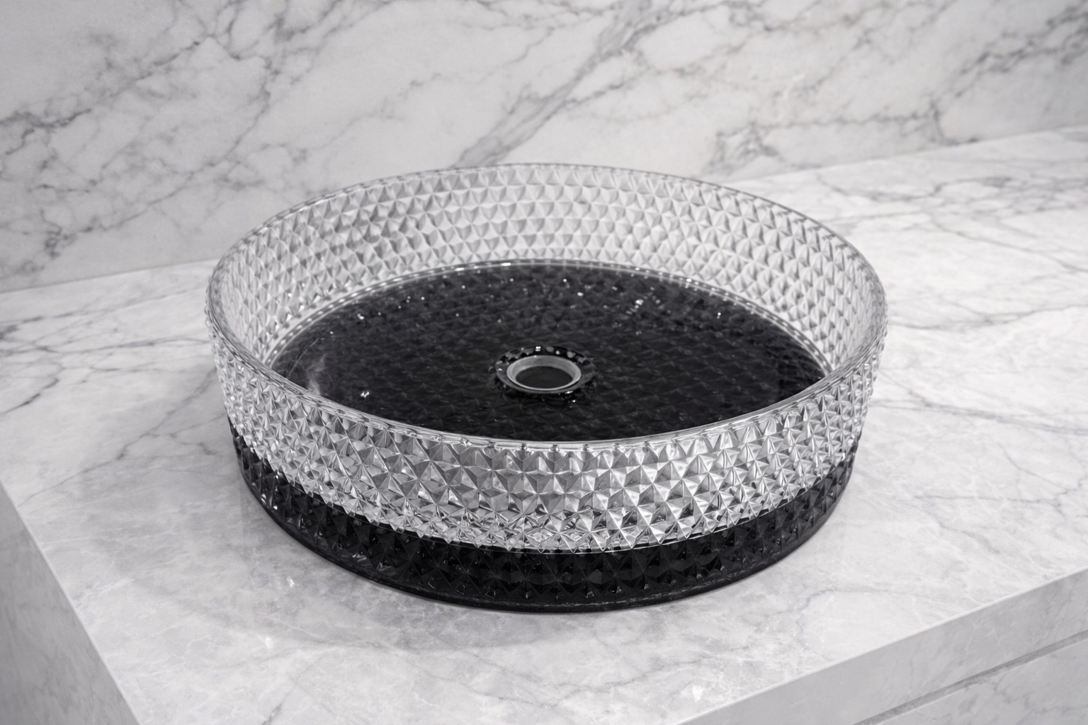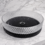 تتميز هذه المغسلة بتصميم هندسي مستوحى من شكل الألماس، حيث يغطي النقش ثلاثي الأبعاد كامل السطح الداخلي والخارجي، مما يعكس الضوء بطريقة جذابة ويضفي لمسة بصرية فاخرة على مساحة الحمام. هذا التصميم لا يقتصر على الجمال فقط، بل يعزز أيضاً من قوة الزجاج ومتانته، مما يجعل المغسلة مناسبة للاستخدام اليومي دون القلق من التلف أو الخدوش.