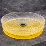 اللون الذهبي الشفاف يمنح المغسلة طابعًا فاخرًا يمكن تنسيقه بسهولة مع أسطح الرخام الأبيض، الرمادي، أو الداكن، كما يتناسب مع خلاطات المياه باللون الذهبي، الكروم، أو الأسود المطفي للحصول على مظهر متكامل وأنيق. هذا التناغم في الألوان يجعل المغسلة قطعة ديكور بارزة تضيف قيمة جمالية عالية للمكان.