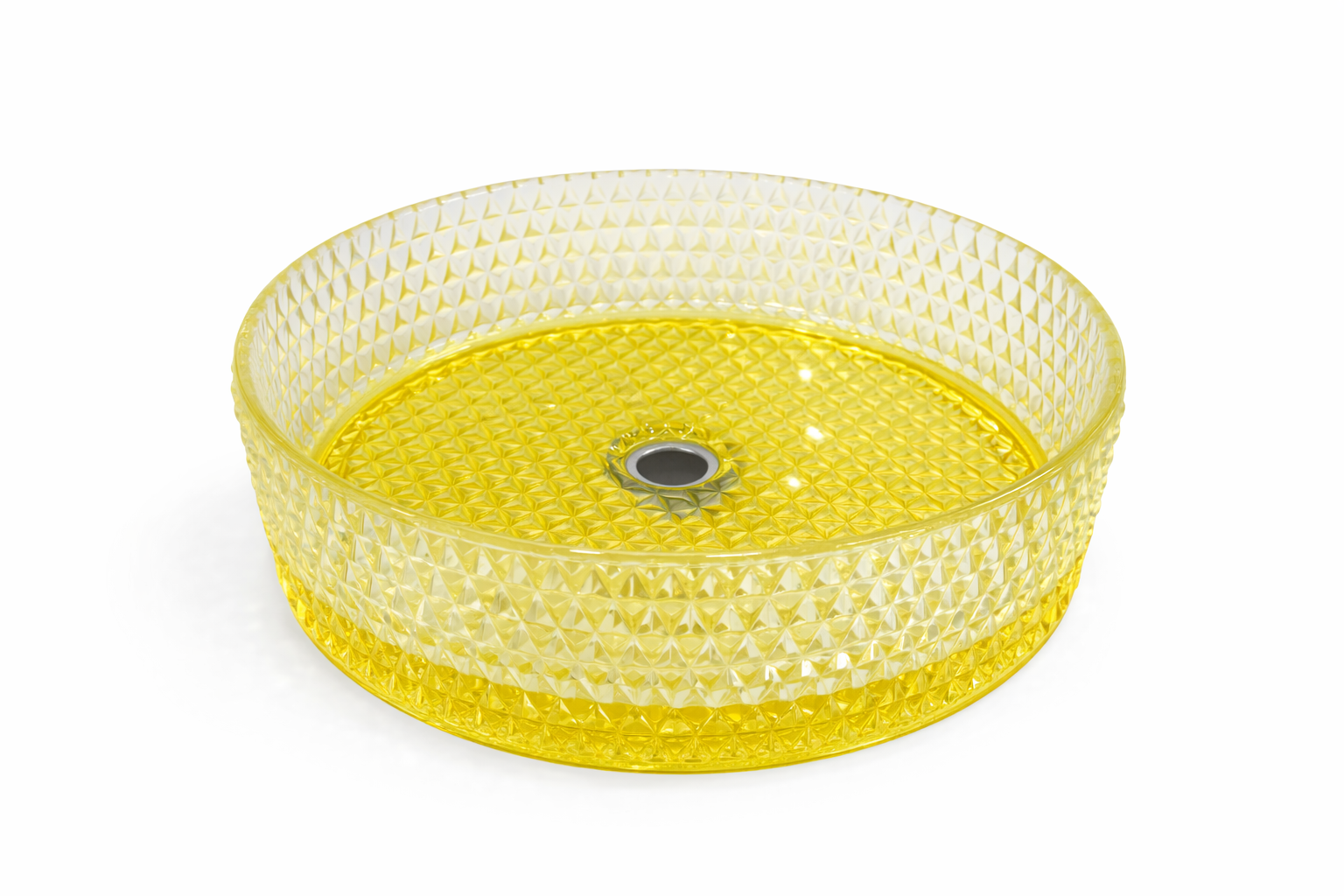 يأتي تصميم المغسلة بنقشة هندسية دقيقة مستوحاة من شكل الألماس، حيث تغطي التفاصيل ثلاثية الأبعاد السطح الداخلي والخارجي بالكامل، مما يعكس الإضاءة بطريقة جذابة ويضيف بعدًا بصريًا مميزًا داخل الحمام. هذا التصميم لا يقتصر على الجمال فقط، بل يعزز من قوة الزجاج ومتانته، ليكون مناسبًا للاستخدام اليومي دون التأثير على الشكل أو الجودة.