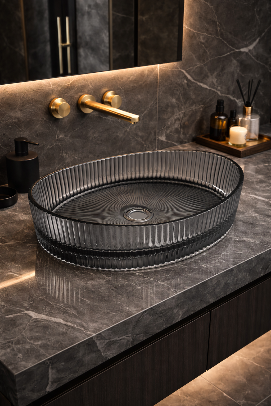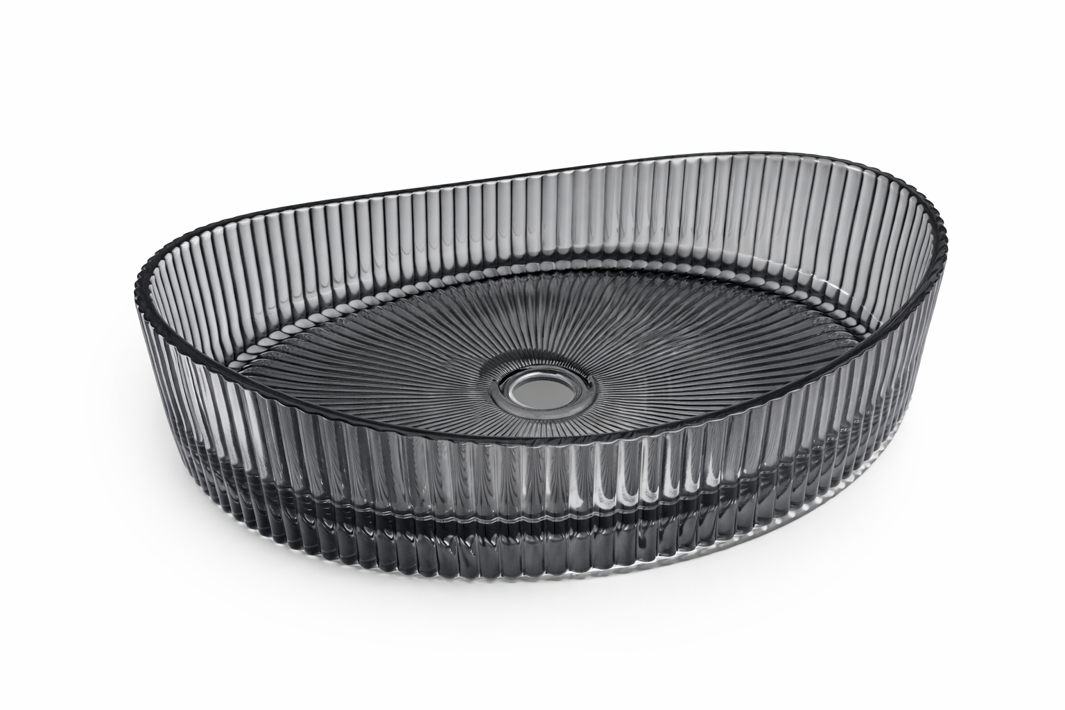 يعتمد التصميم على نقوش مضلّعة عمودية متناسقة مع قاعدة داخلية بنمط شعاعي أنيق، تعمل على انعكاس الضوء بطريقة جذابة تضيف بعدًا بصريًا مميزًا للمكان. كما تم تصميم الحواف بدقة عالية لتمنح الحوض مظهرًا متوازنًا يجمع بين الصلابة والنعومة في آنٍ واحد.